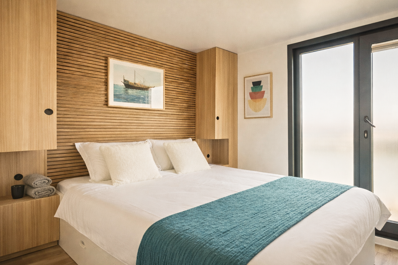 A double bedroom, separate kids’ room with bunk beds, cozy living area with a pull-out sofa and large-screen TV. Perfect layout for 4 adults and 2 children.